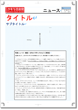 ●当社の縦版写真ニュースに“模した”オリジナル写真ニュースを、文書作成アプリの Microsoft Word で作成するためのファイル一式です。左の「基本フォーマット」画像のリンクから、「基本フォーマット」と右の「制作例」の2つのWord形式のファイル(sn_sc_nt_fmt.docxとsn_sc_nt_ex.docx)を一つにまとめた圧縮ファイル(sn_sc_nt.zip)がダウンロードできます(保存先を問われずにダウンロードする場合があるので、ご注意ください)。右の「制作例」の画像のリンクからは、「制作例」のPDFファイルが閲覧、ダウンロードできます。ご活用ください。
