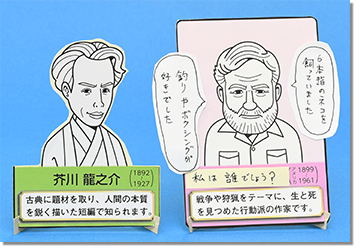 ●2019年6月8日号の特別紙面で掲載した、日本と外国の有名作家のイラストシートです。左の画像のリンクから、芥川龍之介とヘミングウェイの各シートのPDFファイルが開きます。名前をつけて保存してください。図書館ディスプレイや授業の資料、また厚紙を貼り、スタンドをつけて書架に飾る、色を塗って POP 風にする、クイズ風にするなど自由にご活用ください。
