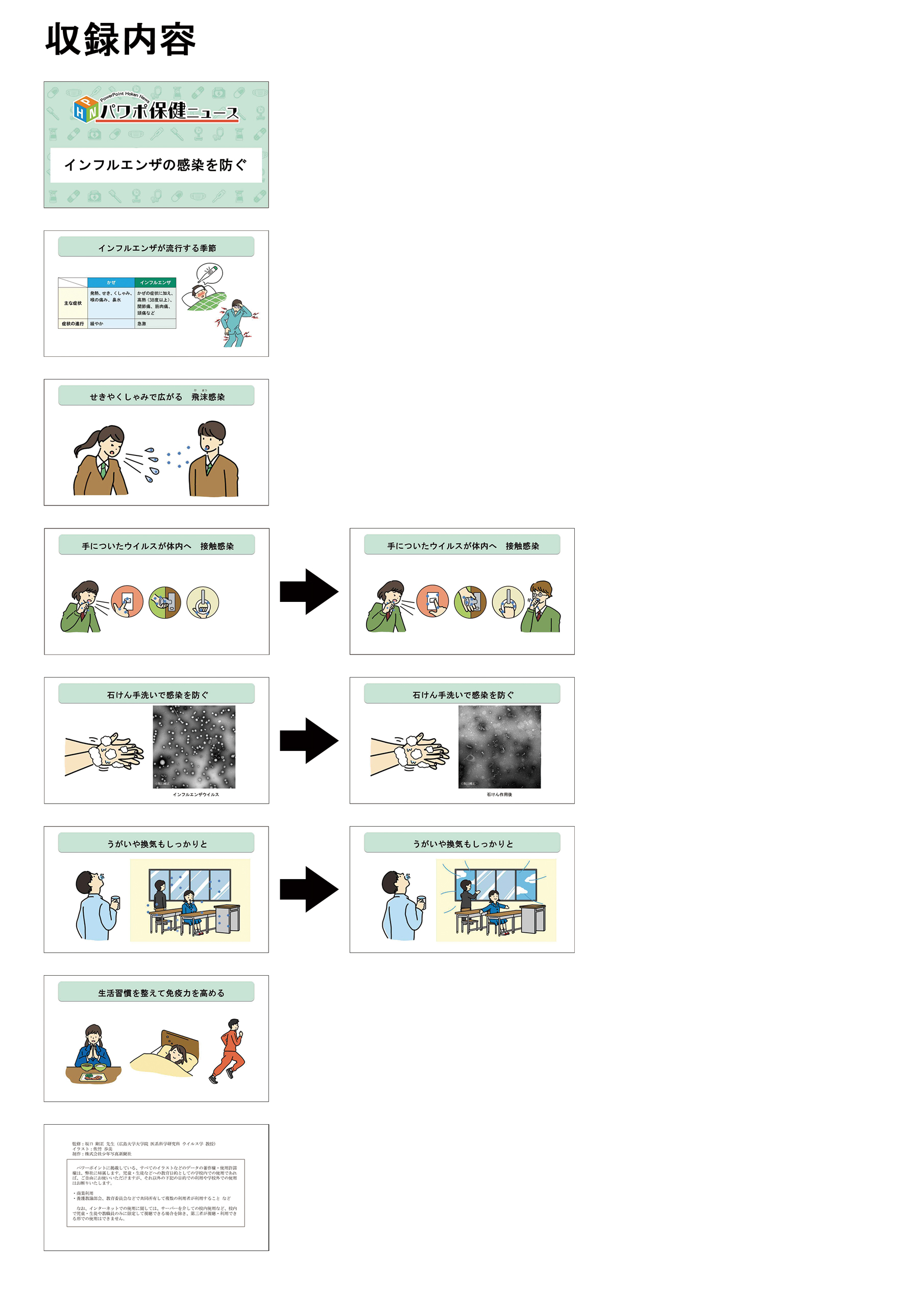 インフルエンザの2種類の感染経路(飛まつ・接触感染)や、手洗い・うがい・換気などの感染予防のポイントなどを、わかりやすく解説しています。