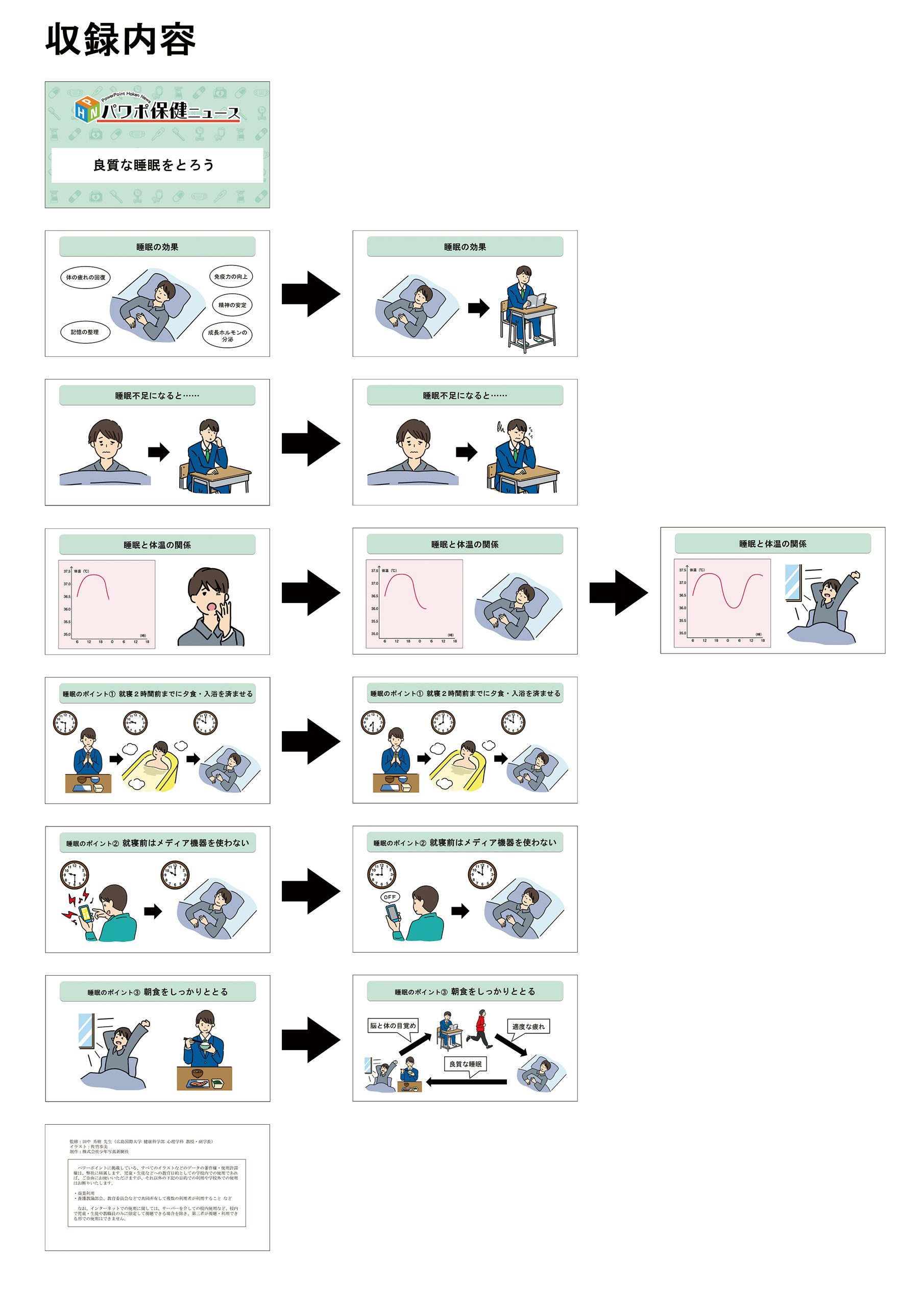 睡眠不足が与える影響や、睡眠と体温の関係、良質な睡眠をとるためのポイント、生活リズムとの関係などを、わかりやすく解説しています。