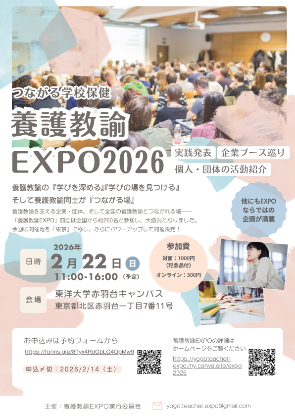 参加対象:現職の養護教諭、養護教諭を目指す高校生や大学生、子供の成長や 健康に関わる活動を行なっている方など