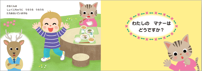 お話を読みながら食事マナーの「なぜそうするのか」も学べます。