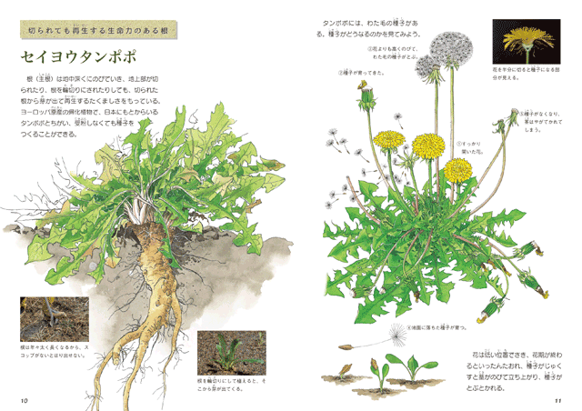 タンポポの種類や花やタネの話、花茎のふしぎな動き、輪切りにした根から芽が出る話など、観察・実験したことを絵と写真でいっぱい紹介。