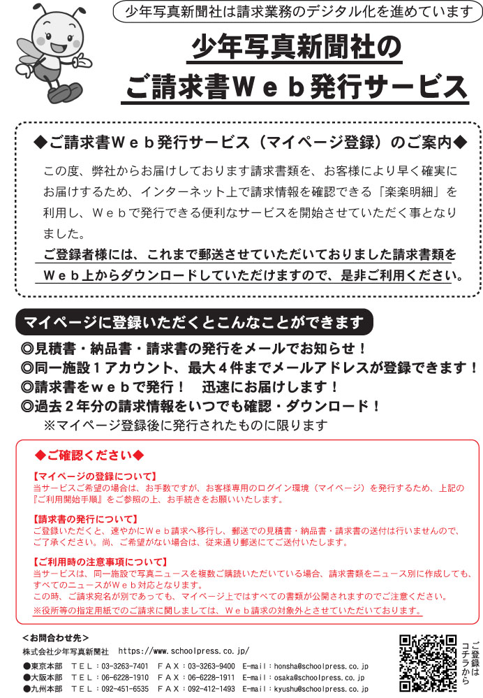 ニュース詳細 ご請求書web発行サービス ※ご請求書のweb発行は、写真ニュースのご購読に限らせていただきます。 ※一部地域ではご登録いただけない場合がございます。 ※役所の指定書類でのご請求の場合は、利用できません。 ※新規登録についてのご利用開始手順は 《こちら》でご確認ください